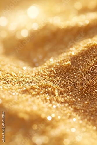 Golden shimmering sand with sparkling reflections in soft sunlight, creating a warm and luxurious texture.