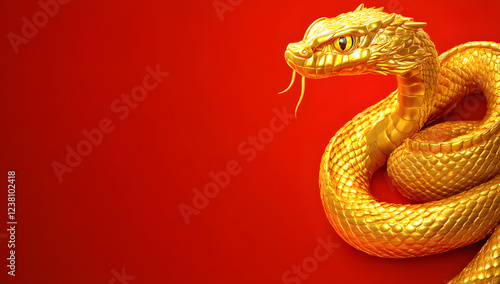 Golden snake with a red background, Chinese New Year theme, glittering scales, and fine details. The snake has a dragon head and a serpentine body