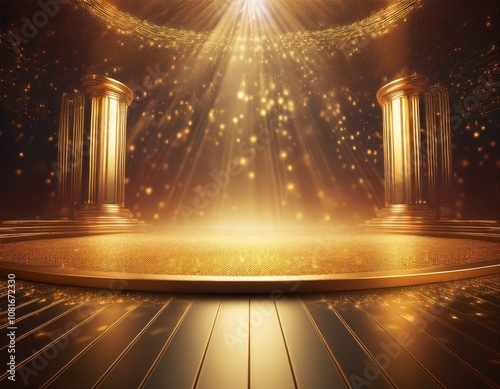 Golden Stage Background with Sparkling Glitters and Spotlights for Glamorous Celebrations