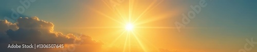 Golden sunburst, vibrant rays extending from center in clear sky, shining, summer, sky