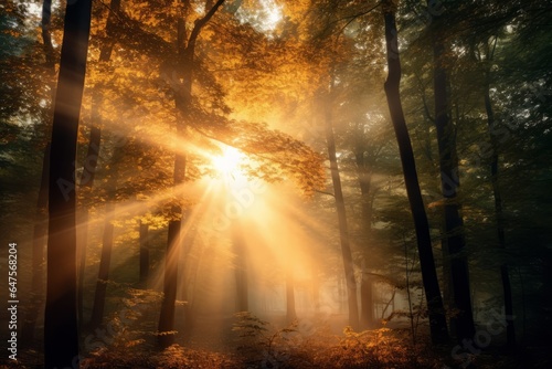Golden sunlight filtering through a dense forest canopy in autumn.