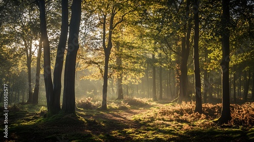 Golden Sunlight Filtering Through Autumn Trees in Vibrant Forest Setting : Generative AI