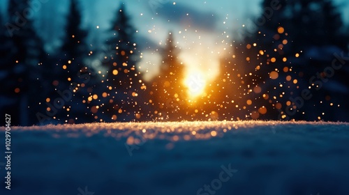 Golden sunlight filtering through snowy trees, creating a magical winter atmosphere.