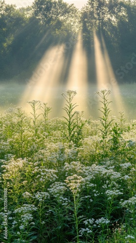 Golden sunlight filters through leaves, casting soft shadows on a meadow of flowers in a tranquil forest as dawn breaks