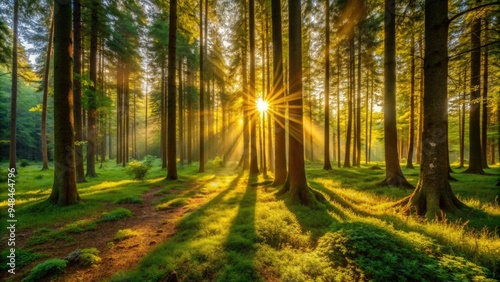 Golden sunlight filters through towering trees, casting dappled shadows on the forest floor, illuminating the lush green undergrowth in a serene and idyllic scene.
