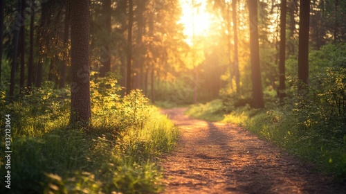 Golden sunlight illuminates a tranquil forest path, evoking peace and natural harmony.