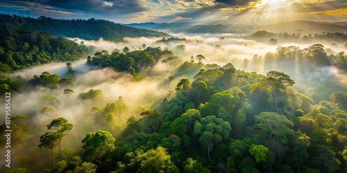 Golden Sunlight Pierces Through Mist and Illuminates a Verdant Canopy of Trees in a Remote Forest