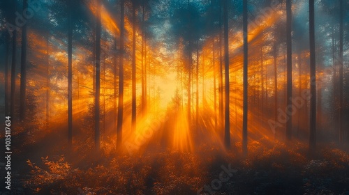 Golden Sunlight Rays Through Misty Forest Trees at Sunrise