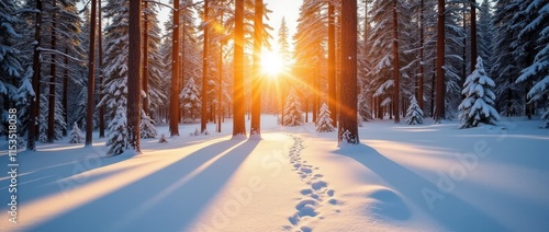 Golden Sunlight Streams Through a Snowy Forest Revealing Fresh Footprints