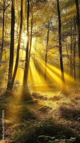Golden sunlight streams through trees in a serene forest, creating a magical and tranquil atmosphere for nature lovers.