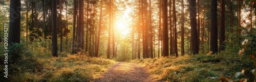 Golden Sunlit Winding Trail in Serene Pine Forest