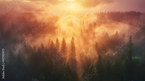 Golden Sunrise Over Foggy Forest - Aerial View Photo
