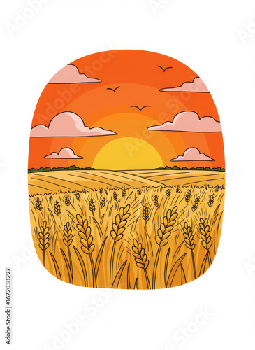 Golden Sunset Over Wheat Field - A cartoon illustration depicting a sunset over a field of golden wheat, symbolizing harvest, abundance, nature, peace, and tranquility