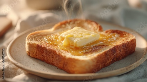 Golden Toast with Butter: A close-up shot of a single piece of golden toast topped with a melting pad of butter on a ceramic plate, capturing the essence of a comforting breakfast.