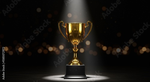 Golden Trophy Award Success and Recognition in Spotlit Glory on Dark Background