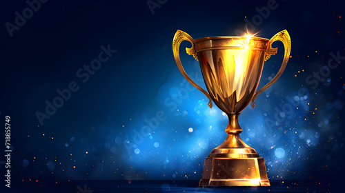 Golden trophy cup with stars isolated on dark blue background with copy space for text
