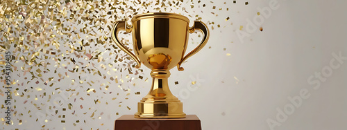 Golden trophy placed on a podium with confetti falling in the background, symbolizing victory and achievement with copy space.