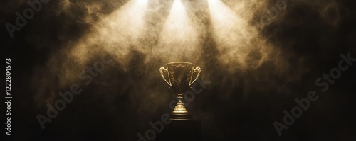 Golden trophy spotlighted in dramatic smoke-filled atmosphere