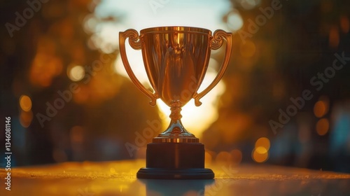 Golden trophy with ornate handles sparkles in evening sunlight
