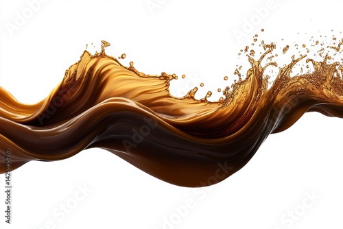 Golden wave on a white background, golden liquid flowing in the shape of a wave, isolated on a transparent or glass texture backdrop. 3D rendering illustration with a long horizontal flow line,