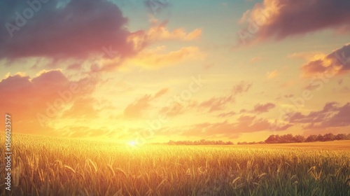 Golden wheat field at sunset. Vibrant colors of the sky blend with the field