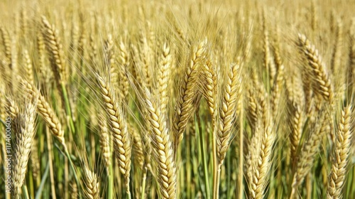 Golden wheat field, ripe ears of grain swaying gently in the summer breeze.