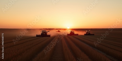 Golden wheat fields being harvested at sunset, combines in action, with dramatic golden hour light