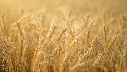 Golden wheat heads fully grown in an open farmland, stylized natural setting. Agricultural idea. Pastoral view. Icon of grain gathering.