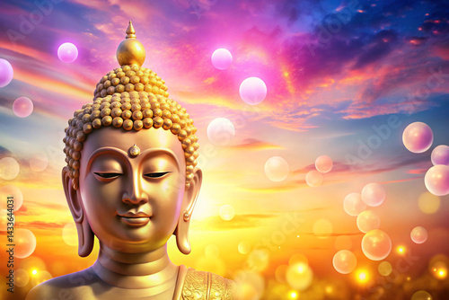 Golden yellow to sky pink with a smiling abstract Buddha face and floating orbs
