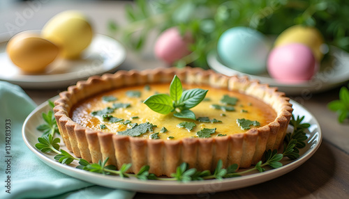 Golden-brown quiche on an Easter brunch table, decorated with fresh herbs and pastel-colored eggs in the background