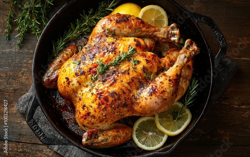 Golden-brown roasted chicken with fresh herbs and lemon slices in a cast iron skillet on a rustic wooden table