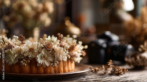 Golden-brown tart and soft-focus floral garland, cozy interior, rustic accents