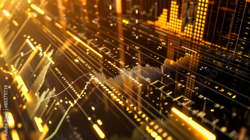 Golden-hued digital display of financial graphs and data points, illustrating complex market trends and analysis. Concept of finance, investment strategies, and the dynamic nature of the stock market
