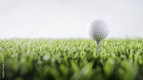 Golf ball placed on a tee, isolated against a white background with green grass, perfect for sports enthusiasts and golf lovers.