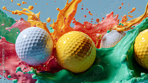 Golf balls surrounded by vibrant splashes of colorful paint on a light blue background