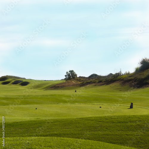 Golf course in Belek. Green grass on the field. Blue sky, sunny day