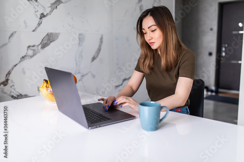 Good looking asian woman enjoying a cup of coffee while relaxing with her laptop in the kitchen. Working from home in quarantine lockdown. Social distancing Self Isolation