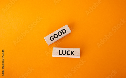 Good luck symbol. Wooden blocks with words Good luck. Beautiful orange background. Business and Good luck concept. Copy space.