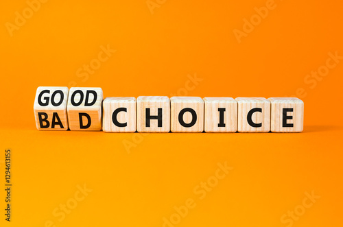 Good or bad choice symbol. Concept words Good choice or Bad choice on beautiful wooden blocks. Beautiful orange table orange background. Business good or bad choice concept. Copy space.