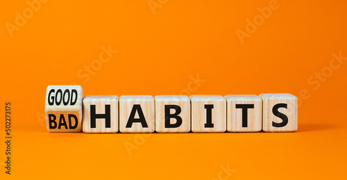 Good or bad habits symbol. Turned wooden cubes and changed concept words Old habits to New habits. Beautiful orange table orange background. Business old or new habits concept. Copy space.