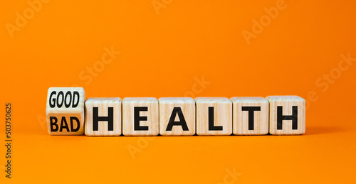 Good or bad health symbol. Turned wooden cubes and changed concept words Bad health to Good health. Beautiful orange table orange background, copy space. Medical good or bad health concept.
