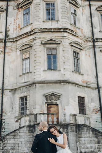 Gorgeous wedding couple embracing in sunlight near old castle in beautiful park. Stylish beautiful bride and groom gently hugging on background of ancient building and nature