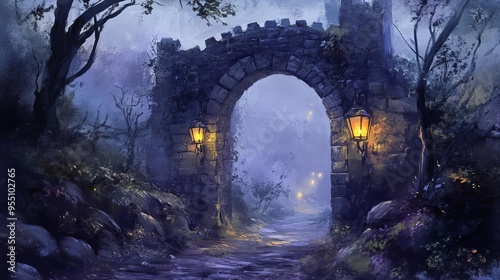 Gothic archway, flickering lanterns, winding path, Watercolor style