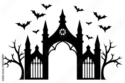 Gothic gate many bats bare trees spooky scene silhouette vector illustration