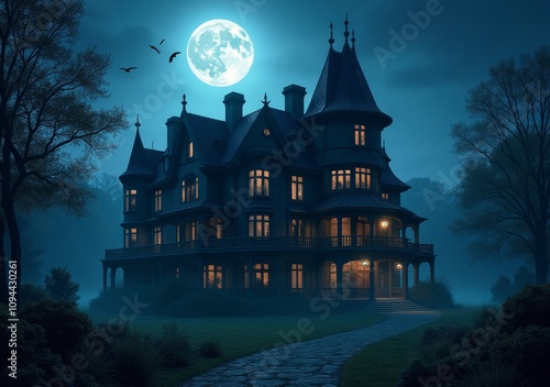Gothic mansion illuminated by moonlight on a tranquil night with a clear sky