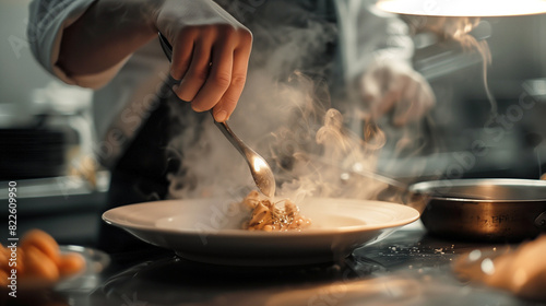 Gourmet dish being prepared in a high-end restaurant kitchen. Generative AI.
