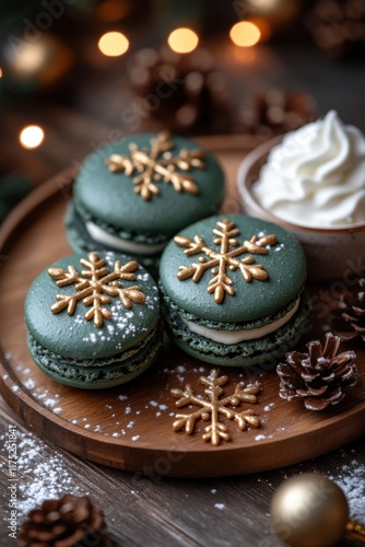 Gourmet festive green macarons decorated with gold snowflakes arranged on a wooden plate with cream and pine cones, creating a cozy winter atmosphere