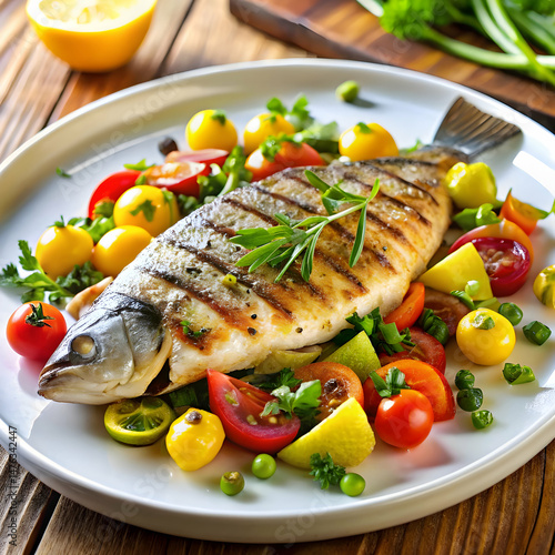 Gourmet grilled fish with colorful vegetables