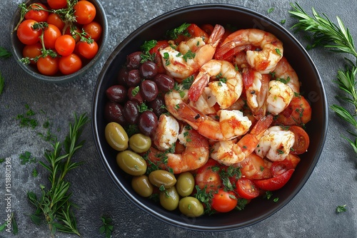 Gourmet Grilled Shrimp Mediterranean Appetizer with Fresh Vibrant Ingredients. Food Photography