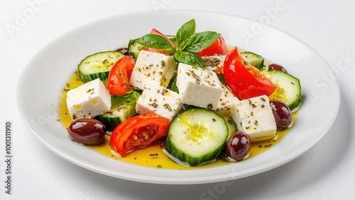 Gourmet lowcarb Greek salad, featuring feta cheese, olives, and cucumber, plated with a touch of olive oil and oregano, elegantly arranged, 3D illustration